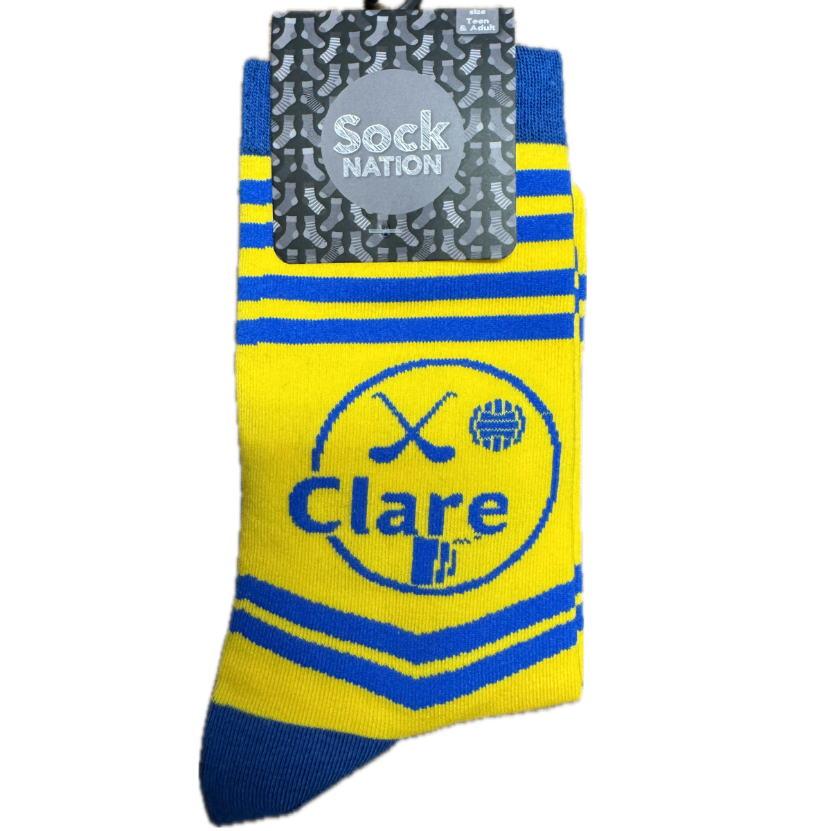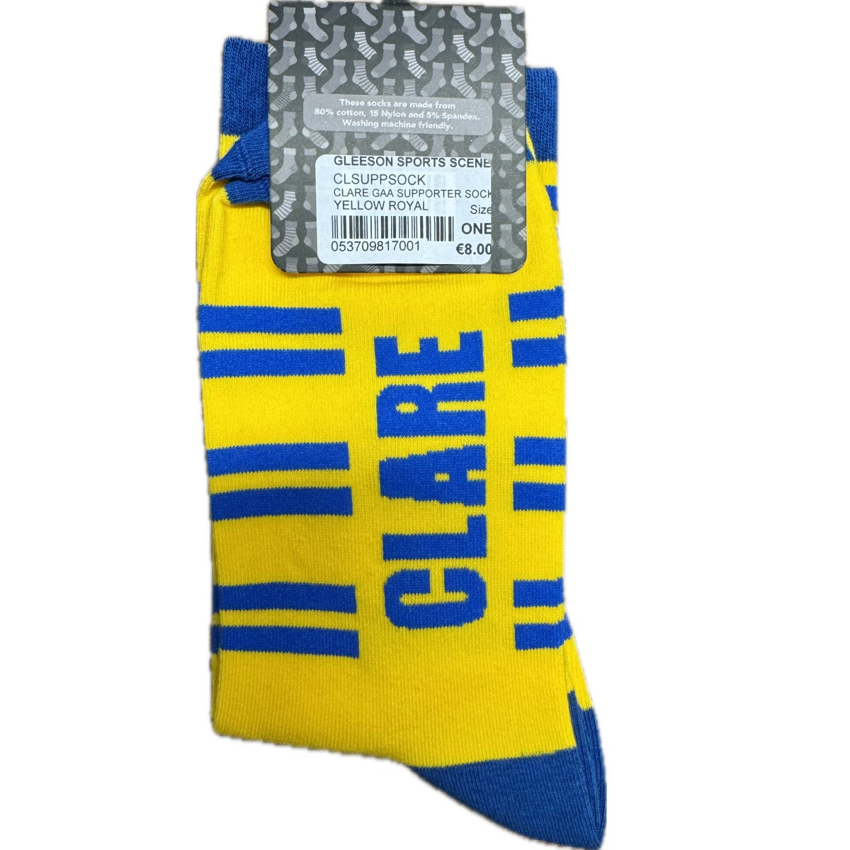 These Clare GAA supporter socks in yellow and royal are designed for ultimate comfort and style. Show your pride and support for the Clare GAA team with these high-quality socks. Perfect for game days or everyday wear, these socks will keep you comfortable and stylish all day long!