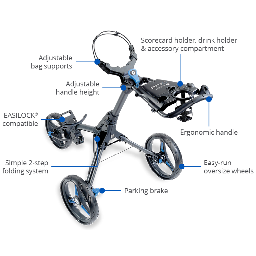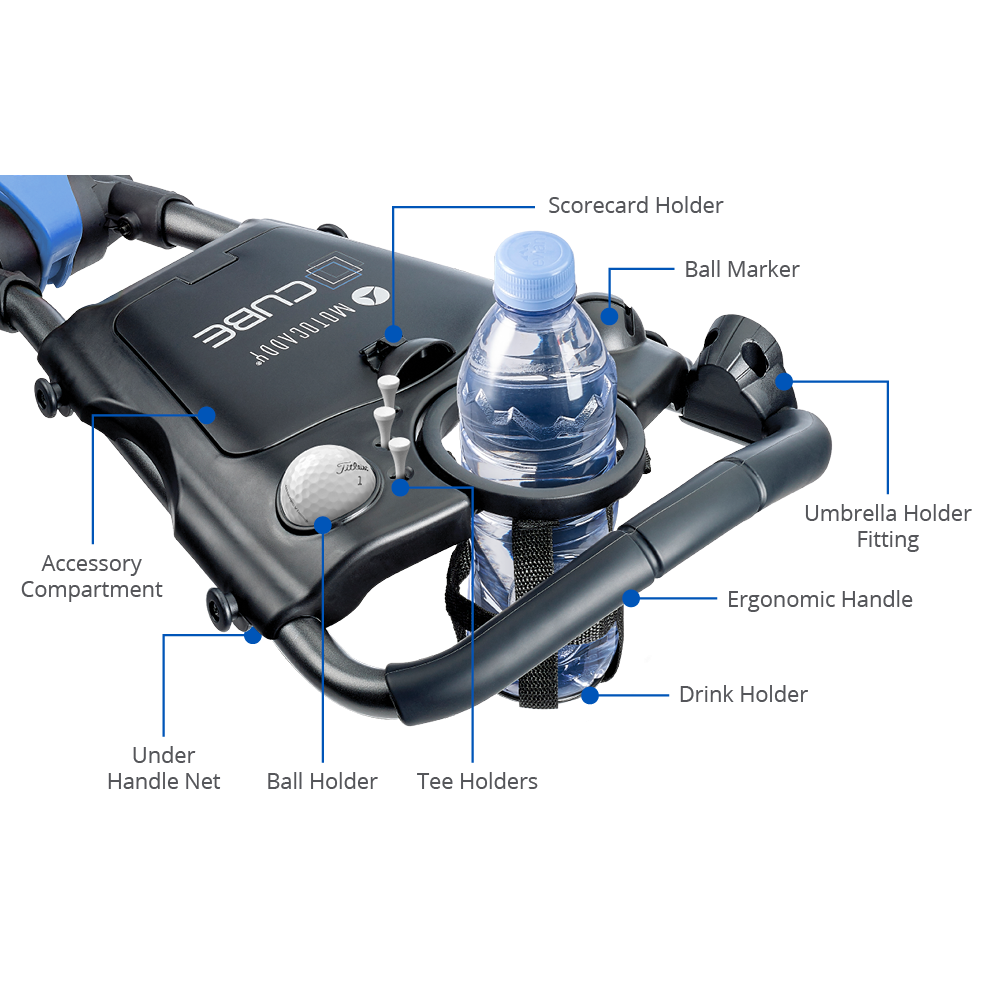 Its ergonomic handle with adjustable height control features generous integrated storage space, including an under-handle net, drink and scorecard holders, an accessory compartment; plus tee and ball holders.
